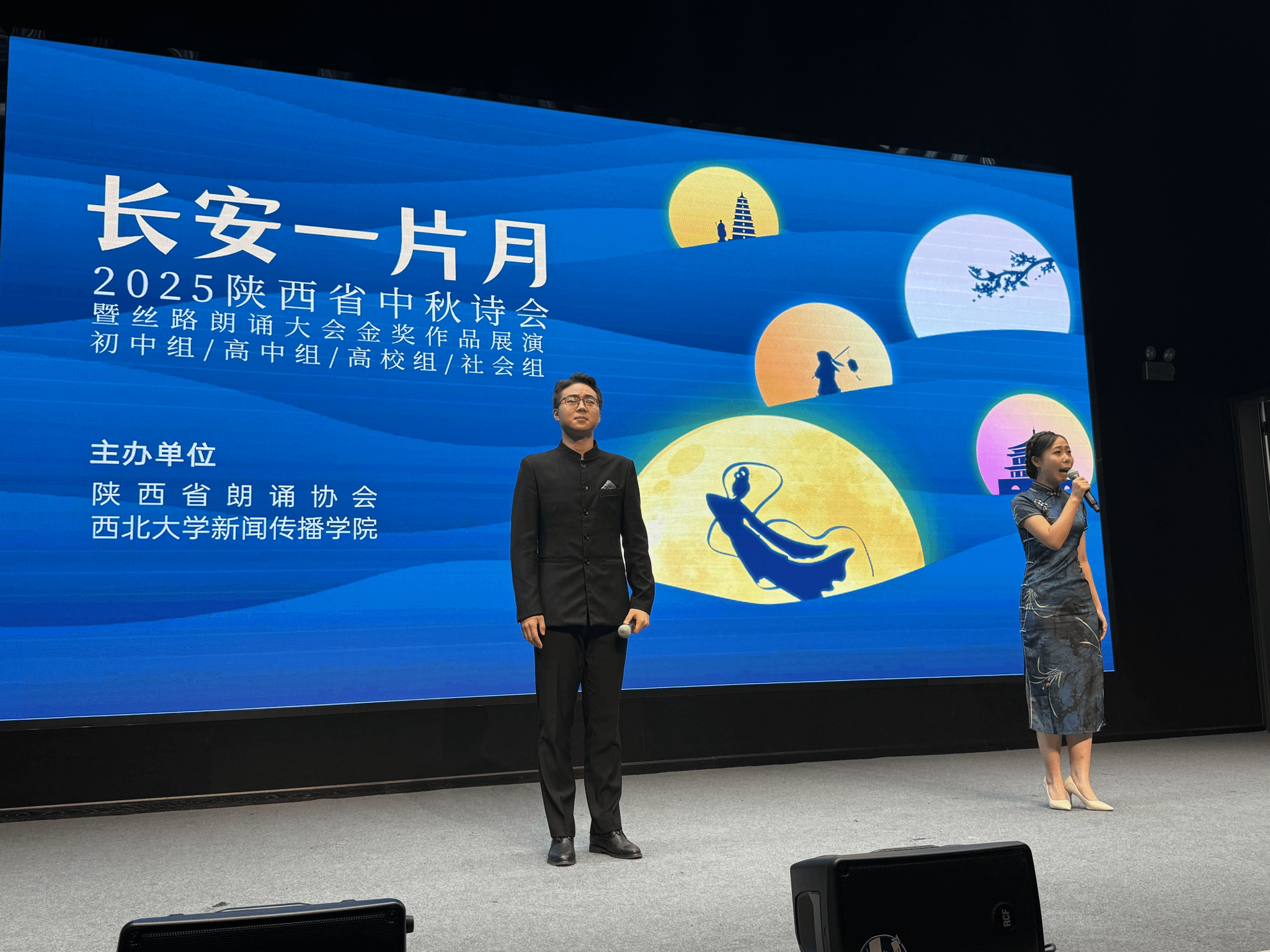 9月24日,“长安一片月”2025年陕西省中秋诗会暨丝路朗诵大会金奖作品展演活动在西北大学新闻传播学院报告厅圆满落幕。文化传媒系播音主持专业樊卓航、朱彤瑞两位同学携朗诵作品《乳娘》登上展演舞台获得一致好评。本次活动由陕西省朗诵协会主办,以中秋文化为纽带,通过朗诵艺术形式,呈现了一场“天涯共此时”的语言艺术视听盛宴。