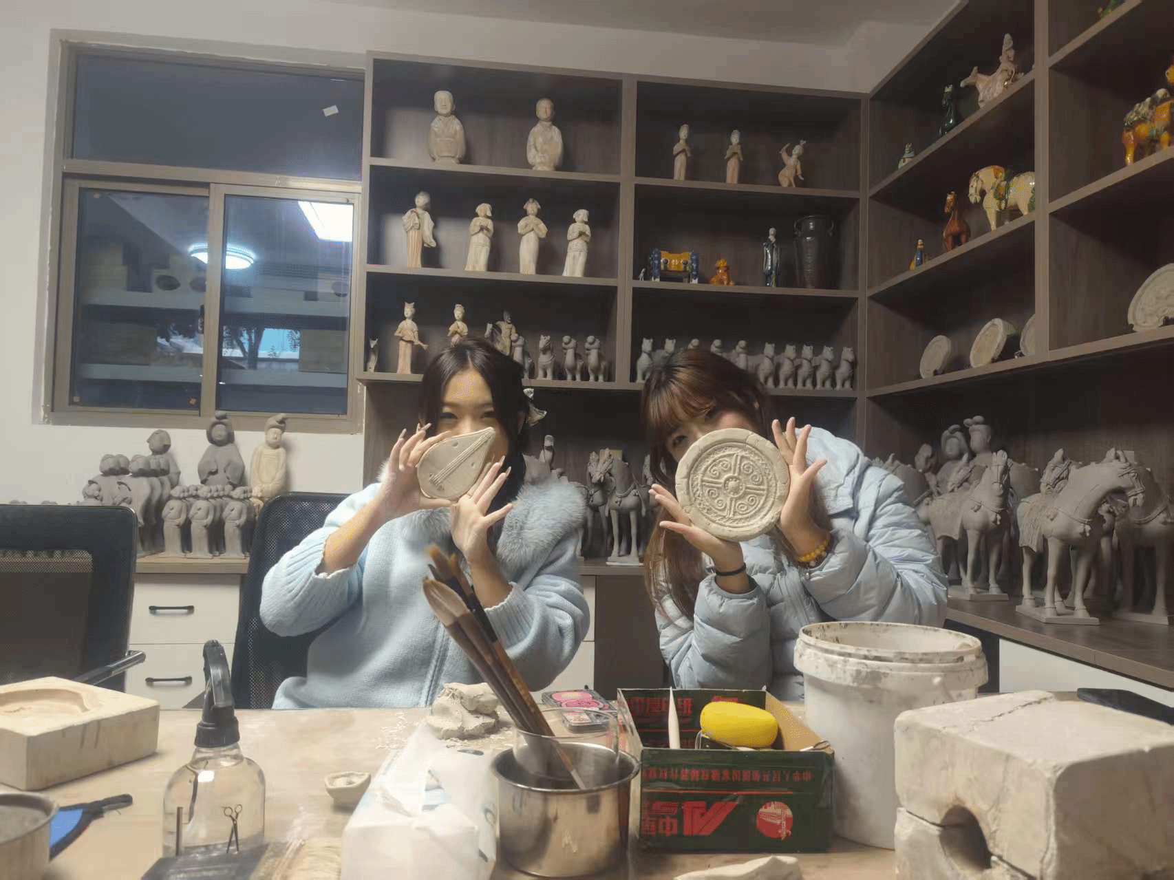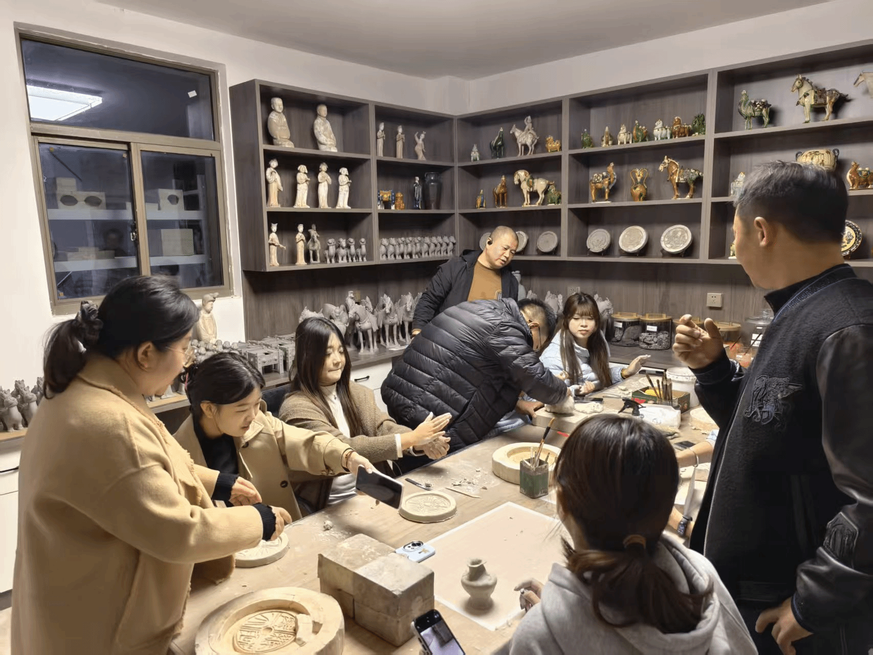 揭牌仪式后,活动进入校外实践环节。王瑜、焦姣老师的带领14名学生代表前往唐三彩烧制基地进行实地研学。同学们首先参观了唐三彩制作的整体流程与工作环境,对传统工艺有了初步认识。随后,谭老师亲自讲解并演示了唐三彩制作的关键步骤与技巧,并指导学生亲手体验陶器成型过程。基地陶艺教师团队全程跟进指导,及时纠正操作细节,耐心解答各类疑问,确保每位同学都能沉浸式感受传统工艺的精髓。