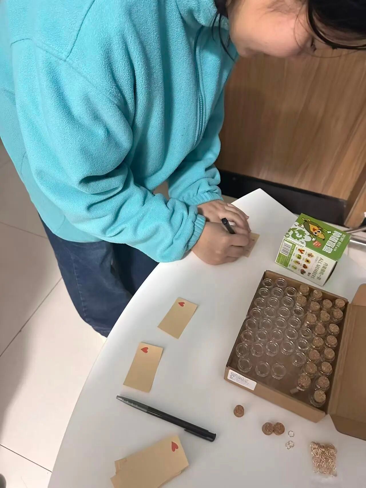 “闪闪发光的自己”活动则为师生提供了一个向内探索、自我肯定的空间。活动现场,志愿者为每位参与者分发彩色小纸条与签字笔,鼓励大家写下自己的闪光点——无论是“坚持完成了一次很难的作业”“善于倾听朋友的烦恼”这样的当下特质,还是“未来想成为一名温暖的文字工作者”这样的美好期许,无需署名,只需真诚表达。同学们静下心来梳理思绪,将对自己的认可与期待诉诸笔端,再小心翼翼地折叠纸条,放入装饰精美的透明玻璃瓶中。这些承载着自信与期许的纸条,不仅帮助大家缓解了潜在的自我否定情绪,更汇聚成系部心理正能量的象征,持续传递着“每个人都值得被看见”的温暖理念。