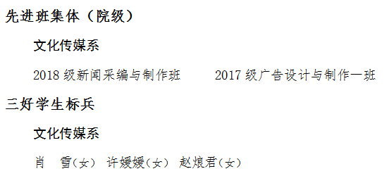 根据《关于评选表彰2018—2019学年度先进班集体、先进个人的通知》和《陕西青年职业学院学生评先选优及奖励实施办法》文件精神,经学生本人申请,班级评议推荐,各系调查、复核,学生处审核,现将先进班集体、三好学生标兵、三好学生、优秀学生干部名单予以公示。